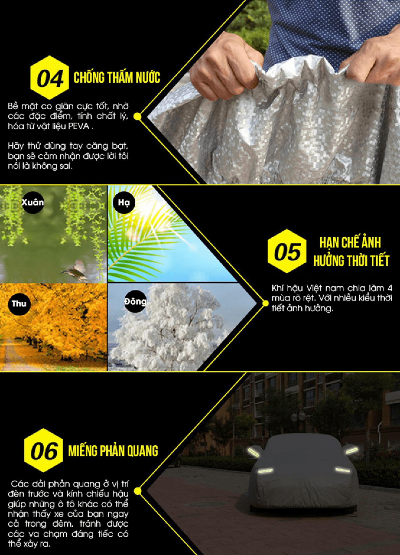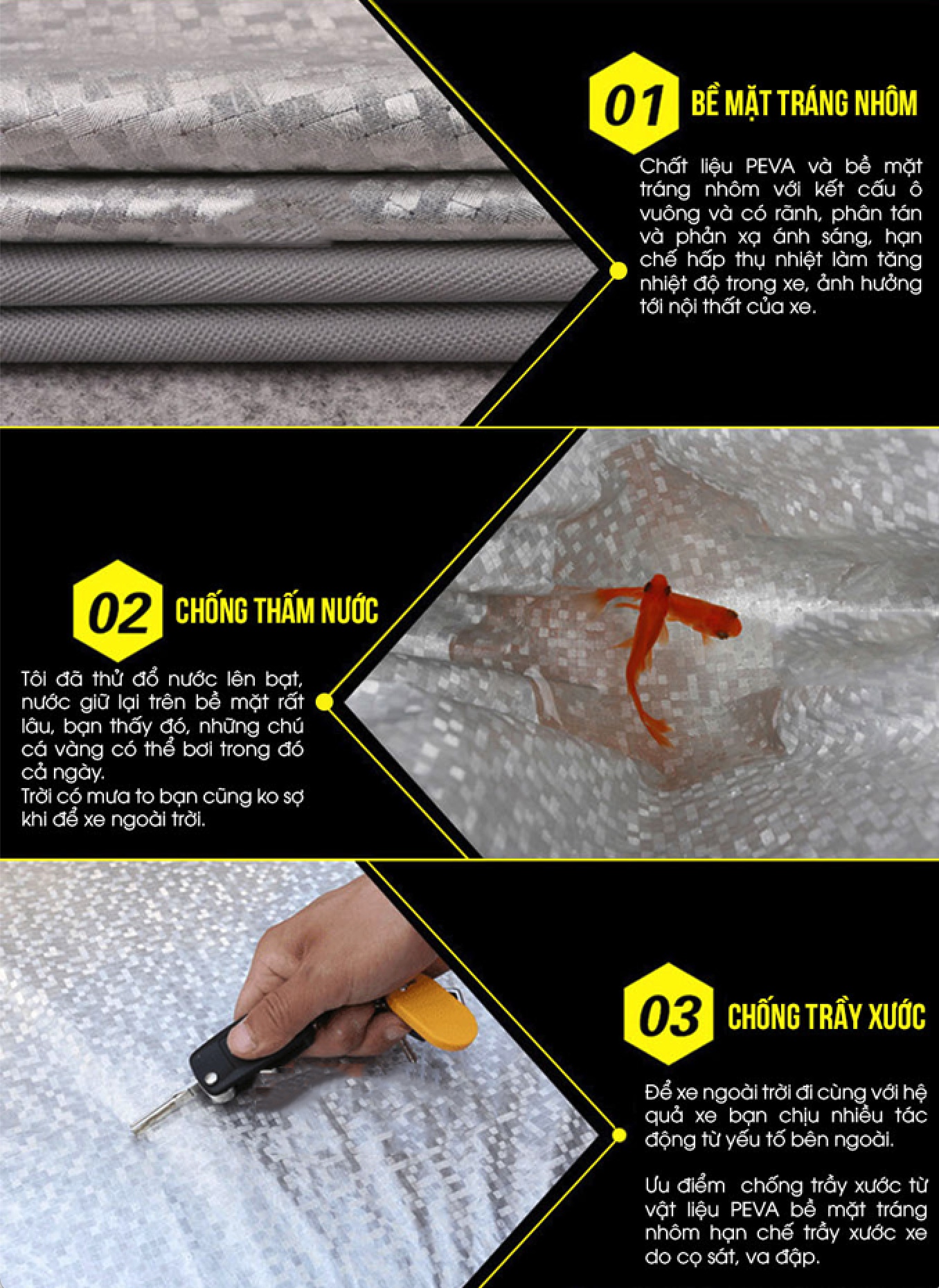 PEVAL là chất liệu siêu bền, chịu nhiệt rất tốt, dai và chắc giúp chống nắng nóng, chống thấm nước và chống bám bụi hiệu quả cao, thích hợp với môi trường, khí hậu ở Việt Nam. Bạn hoàn toàn có thể yên tâm chiếc bạt trùm xe ô tô, giữ cho xe luôn mát mẻ, giảm bớt những hư hỏng không đáng có. Mặt ngoài bạt trùm xe ô tô được phủ một lớp tráng nhôm phản quang, chống tia cực tím, cách nhiệt, hạ nhiệt độ trong xe khi thời tiết nắng nóng, đảm bảo độ bền lâu cho thiết bị trong xe.